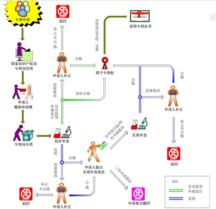 發(fā)明、實(shí)用新型和外觀設(shè)計(jì)專利的申請、審查流程圖如下: